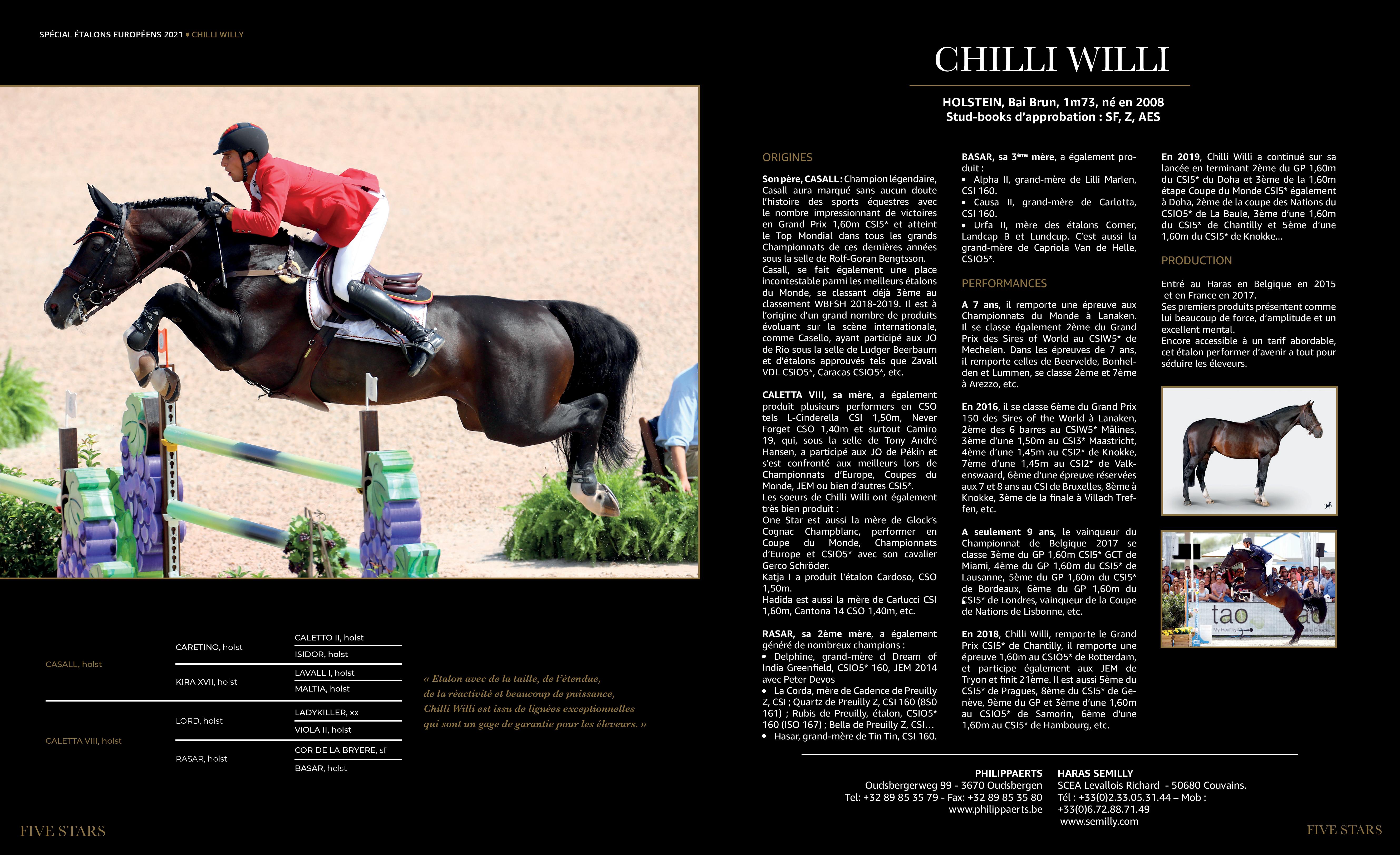 Etalon avec de la taille, de l’étendue, de la réactivité et beaucoup de puissance, Chilli Willi est issu de lignées exceptionnelles qui sont un gage de garantie pour les éleveurs.