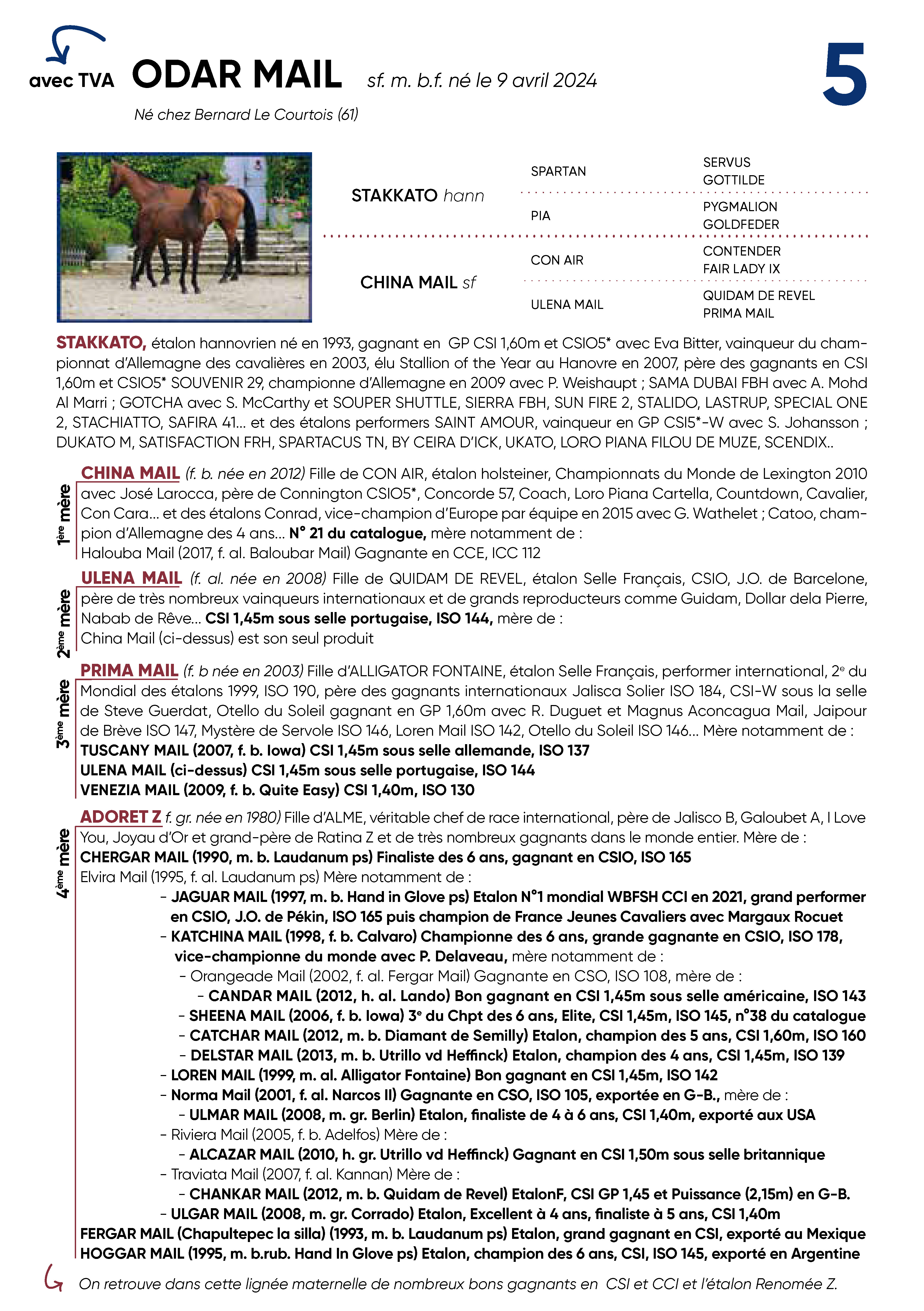 Un magnifique fils du chef de race international STAKKATO avec une fille du célèbre étalon CON AIR. Sa grand-mère maternelle fille du chef de race QUIDAM DE REVEL est gagnante en CSI3*, GP 1m50. Souche maternelle de la « foundation broodmare » ADORET Z (ALMÉ). Cet athlétique foal a remporté la section mâle du concours Cheval Normandie à Brullemail.