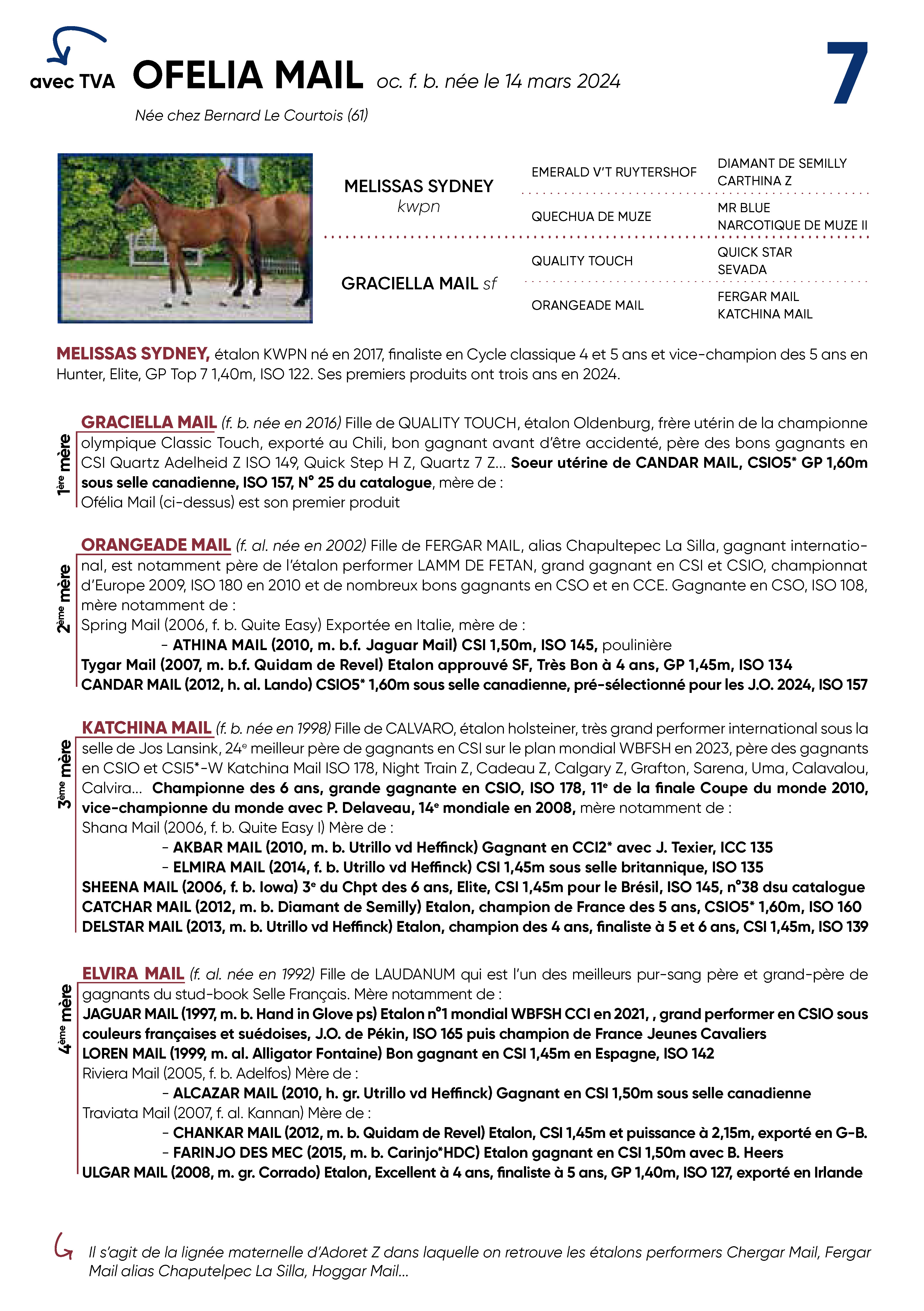 Grande et belle pouliche baie et premier poulain de GRACIELLA MAIL soeur utérine du champion CANDAR MAIL gagnant en CSIO 5* (2ème du GP 1m60 Rolex de Calgary 2023). Son père est le magnifique et styliste jeune étalon noir MELISSAS SYDNEY gagnant en GP 1m40 Top 7 cette année. Souche maternelle directe de la grande championne KATCHINA MAIL.