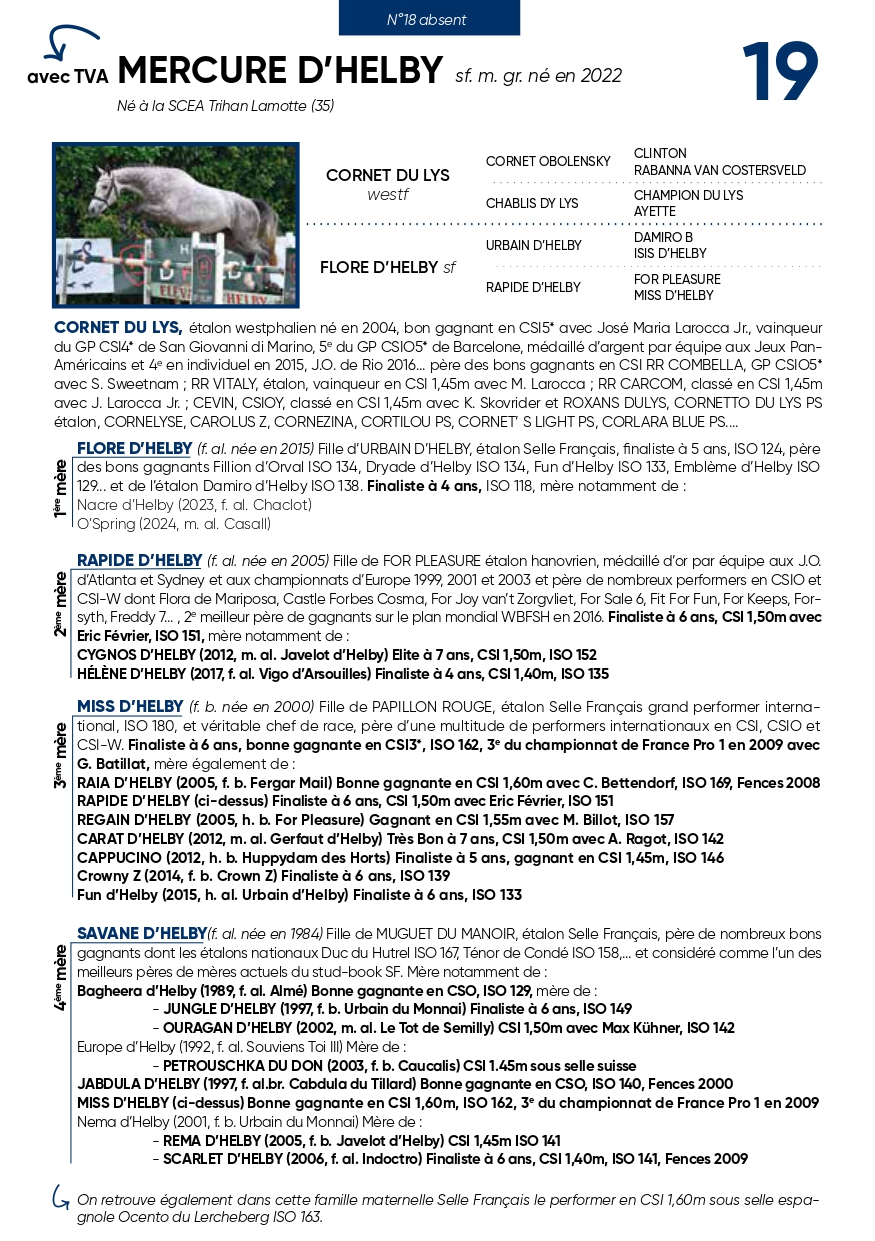 Un fils du très recherché CORNET DU LYS avec la sœur de 2 gagnants en CSI, petite fille de la championne MISS D’HELBY.