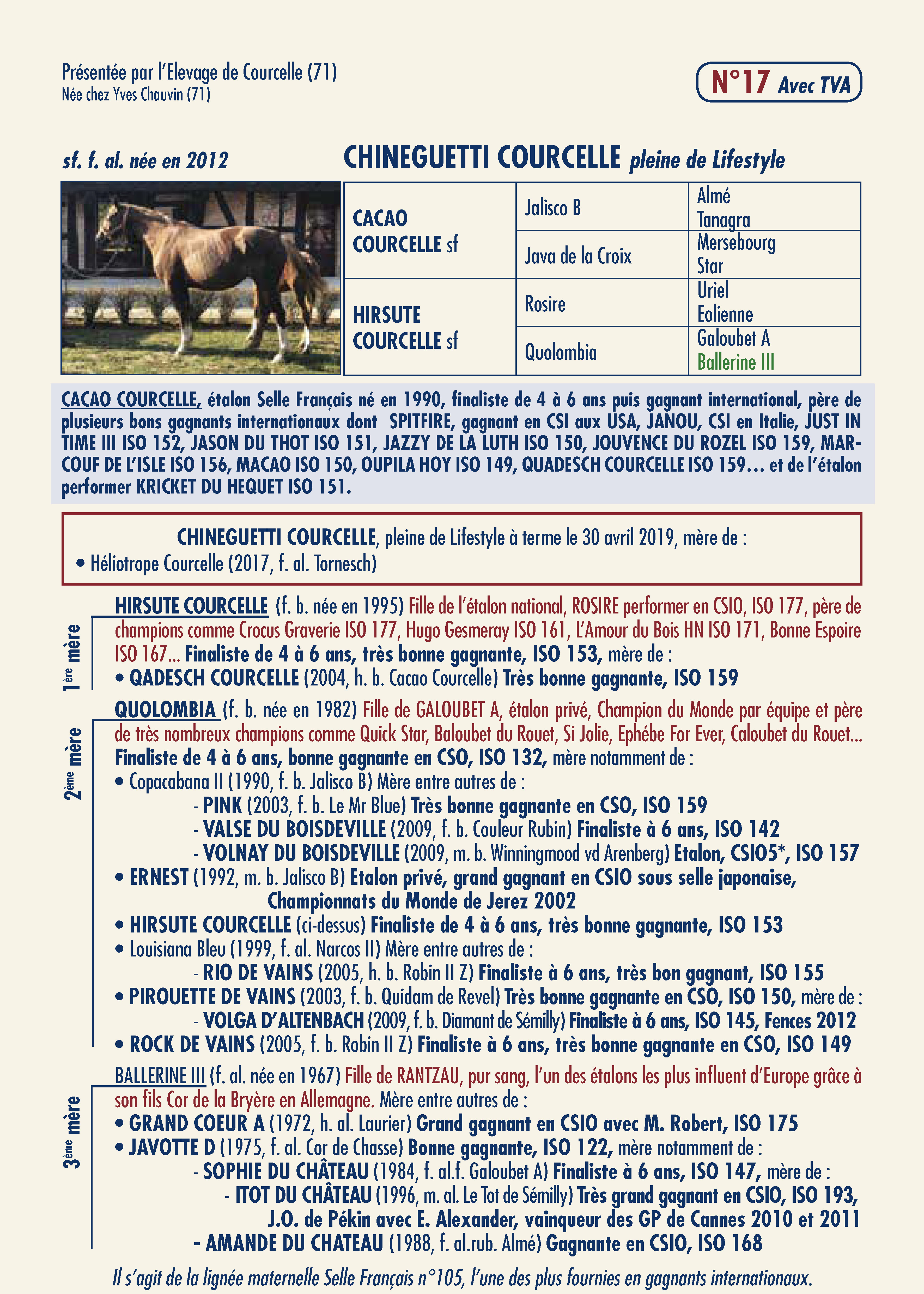 Mare out of 2 champion : CACAO COURCELLES and HIRUSTE COURCELLES. ITOT DU CHATEAU’s damline.
