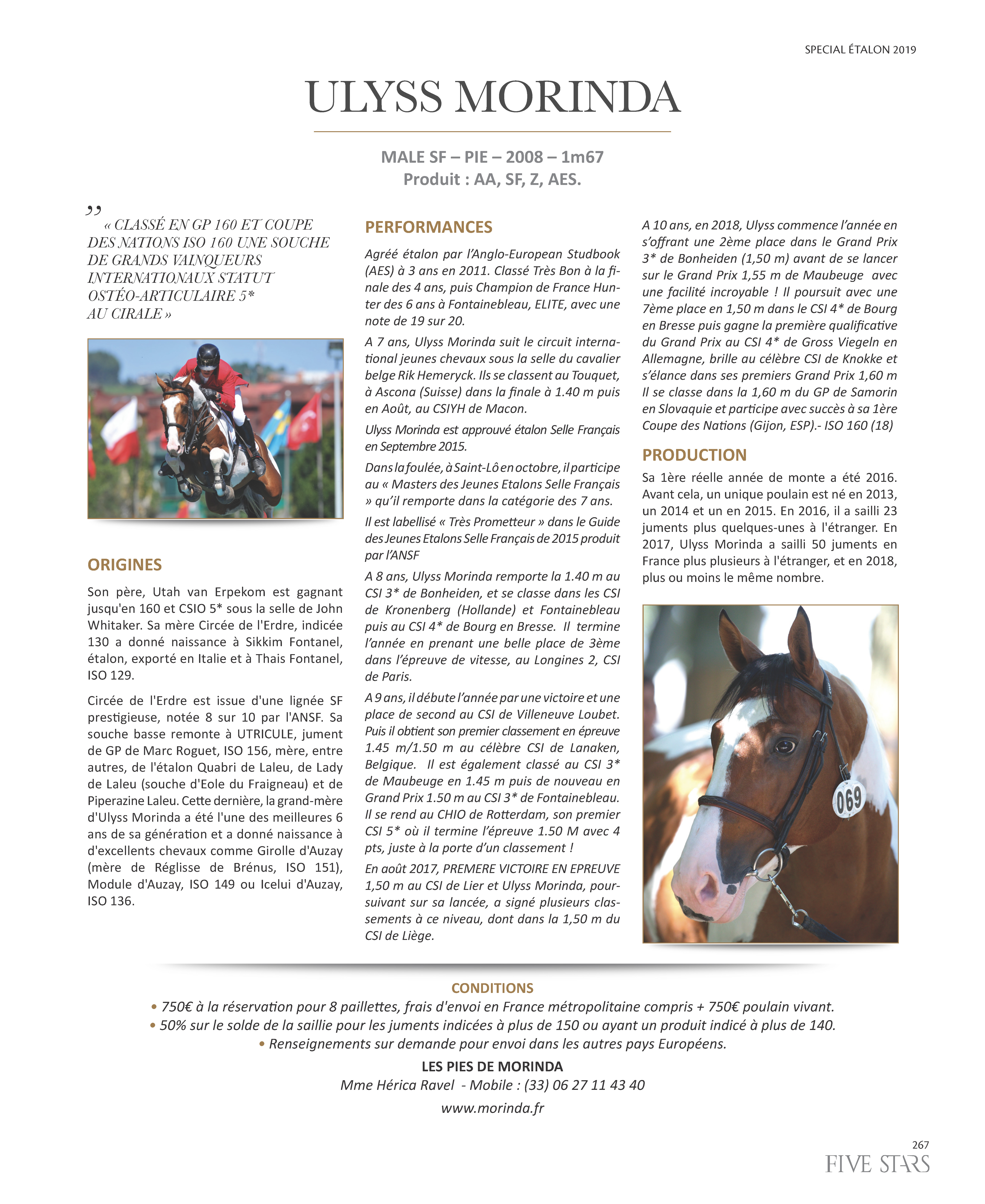 Ulyss Morinda est un étalon exceptionnel qui associe un caractère extrêmement stable et gentil à de très gros moyens à l’obstacle. Il a, en particulier, un excellent passage de dos, beaucoup d’équilibre et est extrêmement rapide dans son geste de devant. Ulyss Morinda a connu une ascension fulgurante vers le haut niveau en 3 ans.